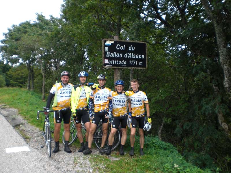 Eerst eventjes terug afdalen, want ook op de Ballon d'Alsace staat het colplaatje niet op de top. En dan allemaal lachen voor de traditionele groepsfoto die genomen werd door de sympathieke mede-hotelgast Jeffrey (zie gastenboek).